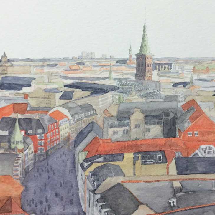 Aquarelle was my favourite paint for many years. My other preferred paint is acrylic. The city displayed is Copenhagen, which I visited in 2014.